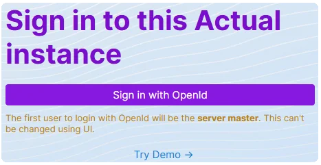 ACTUAL_OPENID_DISCOVERY_URL: URL for the OpenID ProviderACTUAL_OPENID_CLIENT_ID: client_id given by the providerACTUAL_OPENID_CLIENT_SECRET: client_secret given by the providerACTUAL_OPENID_SERVER_HOSTNAME: Your Actual Server URL (so the provider redirects you to this)
