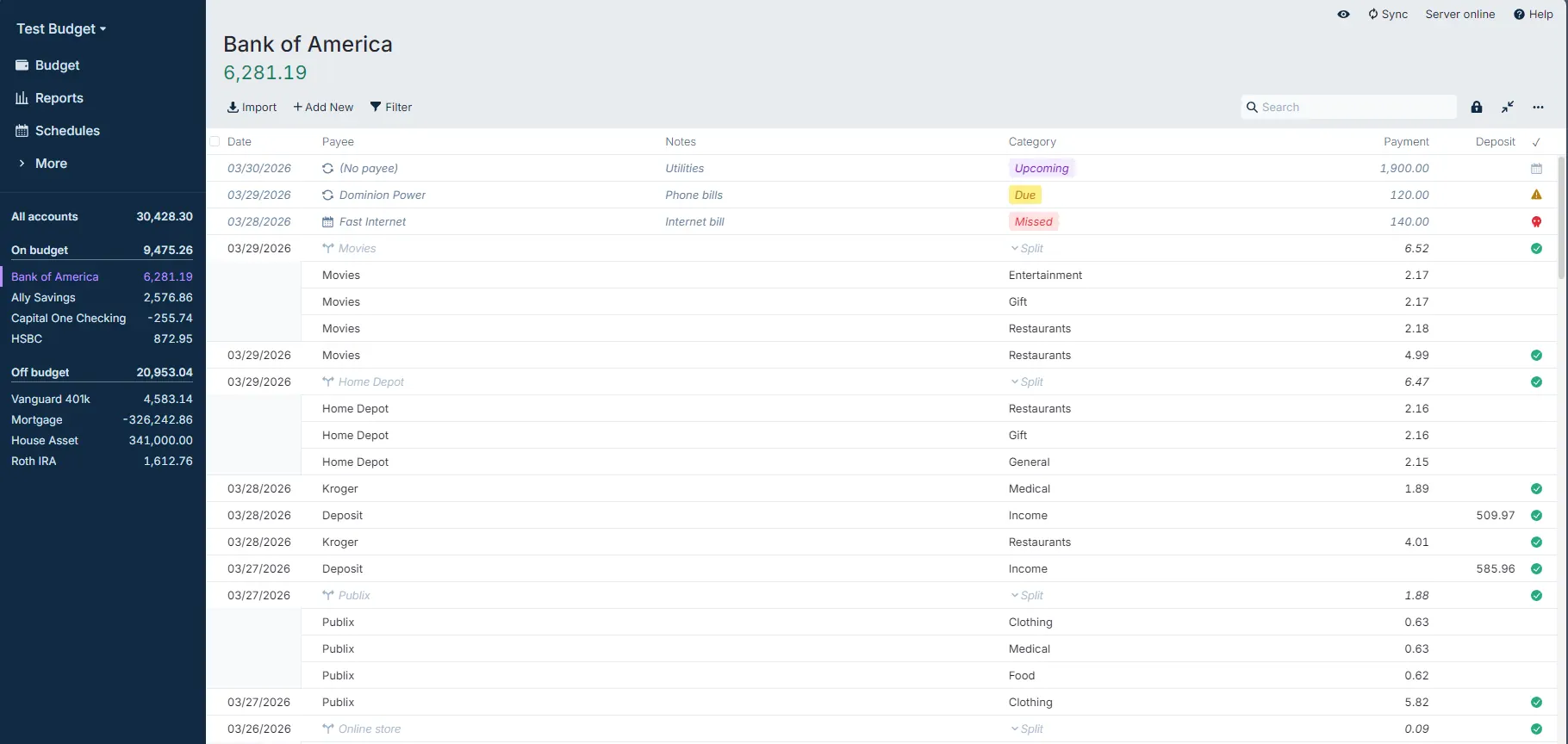 Manually adding transactions can be done by clicking on Add New. The Payee and the Category fields will provide a dropdown menu of available options. You can add new payees directly from this view, but if you need to add a new category, you can only do so from the Budget View.