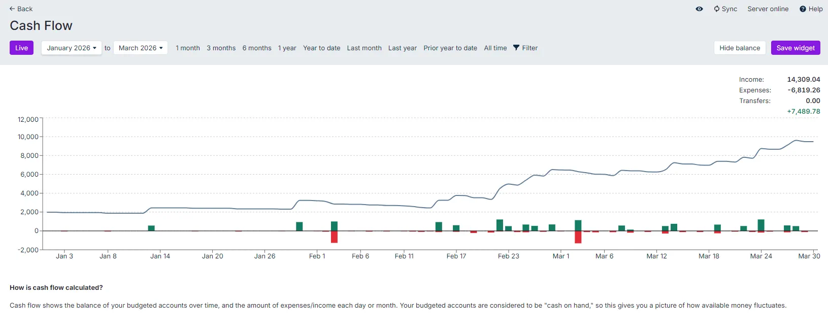 Cash flow tracks your spending over time by focusing solely on budget accounts and displaying their balances. It includes separate visualizations for income and expenses, providing a quick overview of how these factors affect your available money over time. By considering your budgeted accounts as "cash on hand," cash flow clearly shows how your available funds fluctuate.