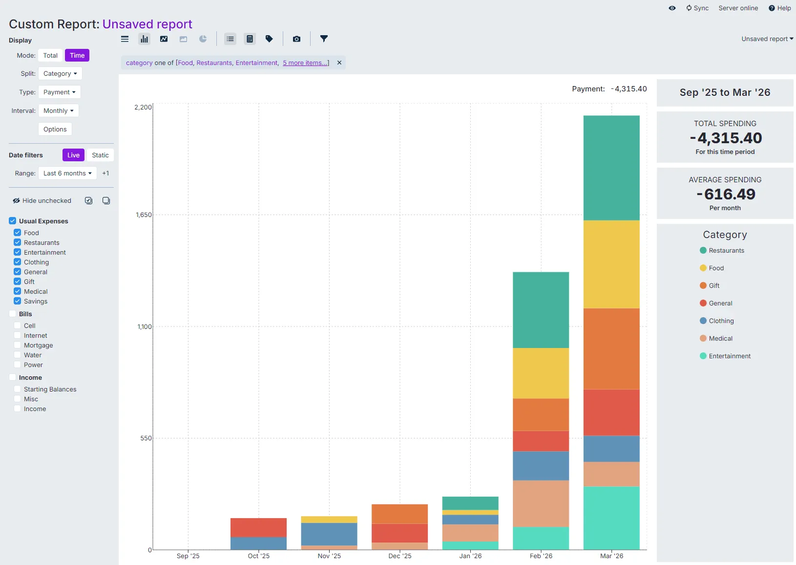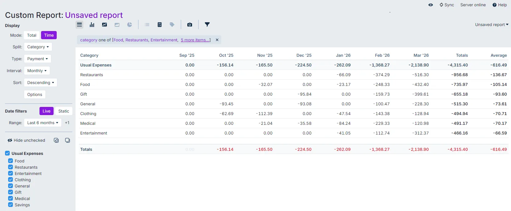 Below are examples of reports covering our Daily Expenses over the last six months. One report shows this as a graph, the other as a table. Note that the table version also shows the sum and average (over six months) for the various categories.