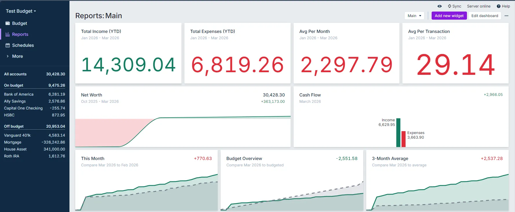 This view gives you access to both the two built in reports, Net Worth and Cash Flow, but also your own custom reports.